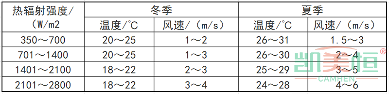 ③工藝上以濕度為主要要求的空氣調節車間,除工藝有特殊要求或已有規定外,不同濕度條件下的空氣溫度應符合下表的規定。