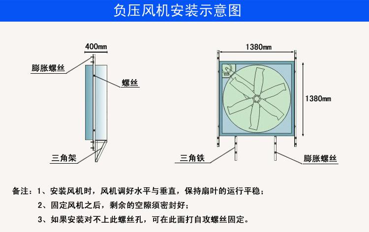 1. 產品檢查:在安裝前,應仔細檢查負壓風機的外框、扇葉、電機、皮帶、百葉窗等部件是否完整無損,避免將有問題的設備安裝上去。