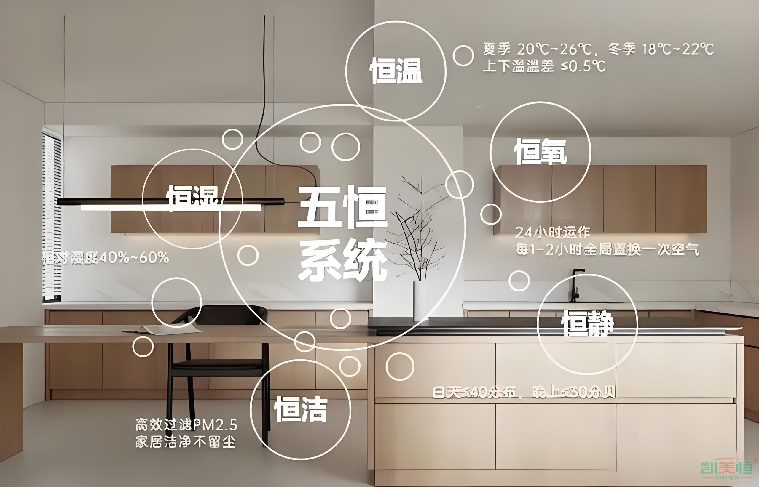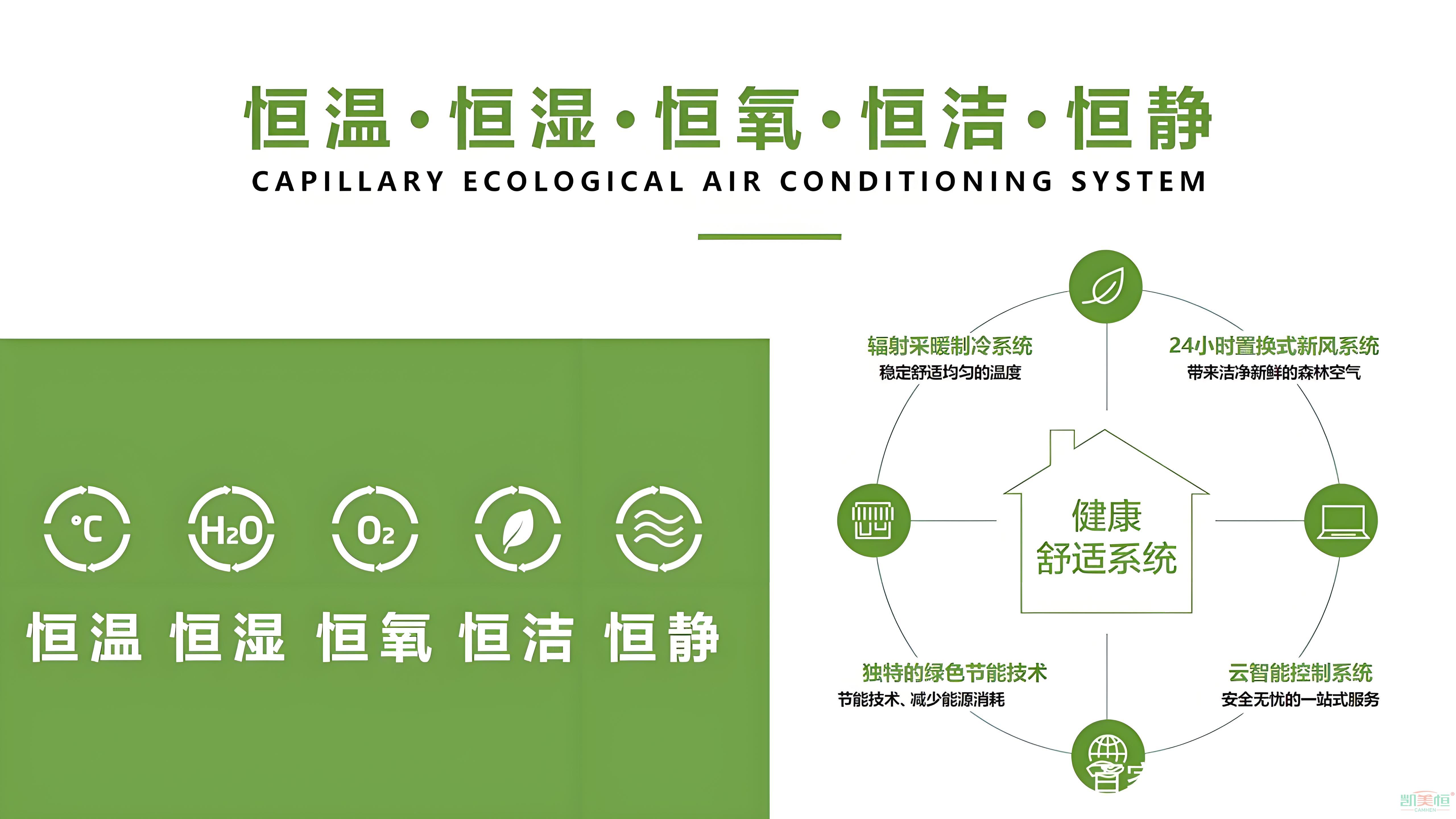 指的是通過毛細管網輻射系統(tǒng)和高效可熱回收的新風系統(tǒng)控制室內的溫、濕度和空氣的潔凈度,核心理念“以節(jié)能為基礎,以智慧控制為核心,以舒適健康為目標”,進而使房間內24 小時內保持恒溫、恒濕、恒氧、恒潔、恒靜的效果。