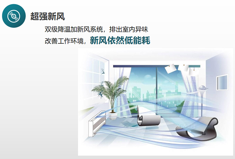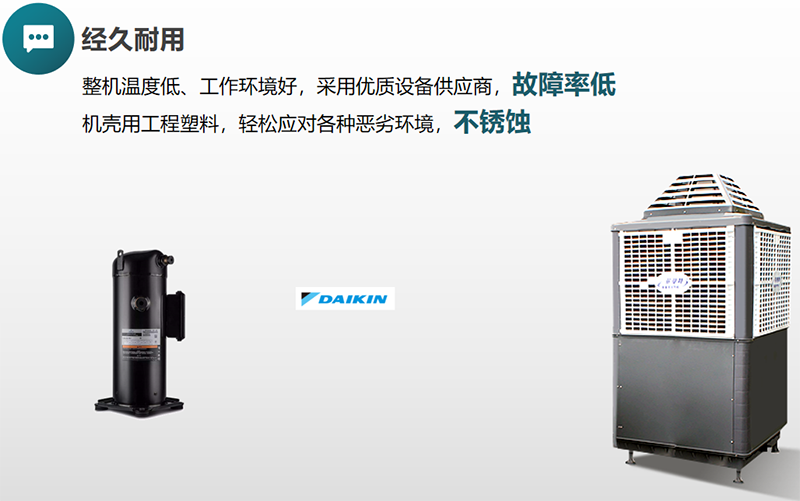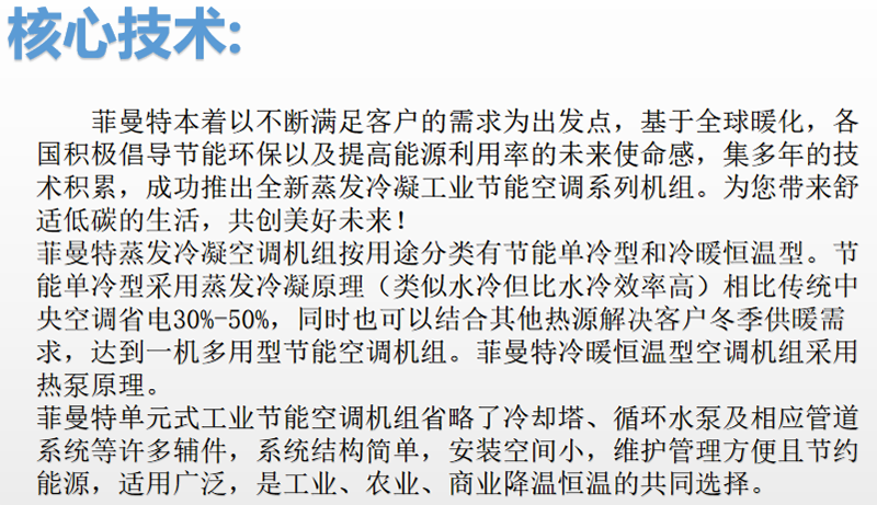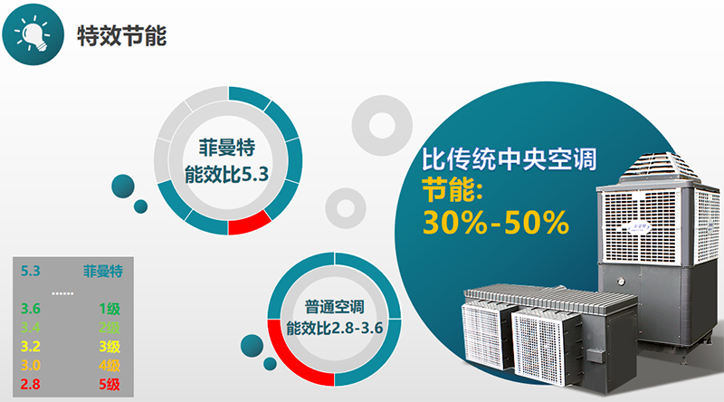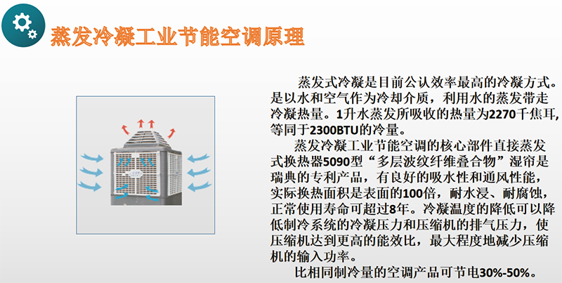 蒸發(fā)式冷凝是目前公認(rèn)效率最高的冷凝方式。是以水和空氣作為冷卻介質(zhì),利用水的蒸發(fā)帶走冷凝熱量。1升水蒸發(fā)所吸收的熱量為2270千焦耳,等同于2300BTU的冷量。蒸發(fā)冷凝工業(yè)節(jié)能空調(diào)的核心部件直接蒸發(fā)式換熱器5090型“多層波紋纖維疊合物”濕簾是瑞典的專利產(chǎn)品,有良好的吸水性和通風(fēng)性能,實際換熱面積是表面的100倍,耐水浸、耐腐蝕,正常使用壽命可超過8年。冷凝溫度的降低可以降低制冷系統(tǒng)的冷凝壓力和壓縮機的排氣壓力,使壓縮機達到更高的能效比,最大程度地減少壓縮機的輸入功率。比相同制冷量的空調(diào)產(chǎn)品可節(jié)電30%-50%。