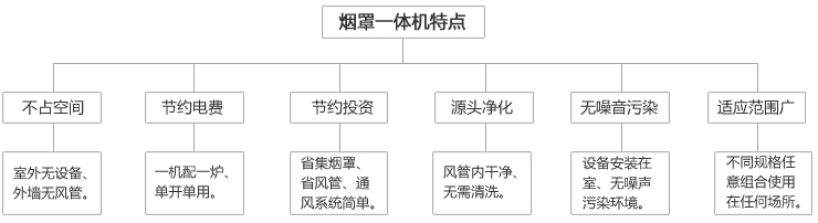 1:采用技術成熟可靠,不浮夸,從油煙一出來就源頭凈化,風機內置煙罩設計,吸力強,克服老式排煙管道長,煙排不出去等難題。